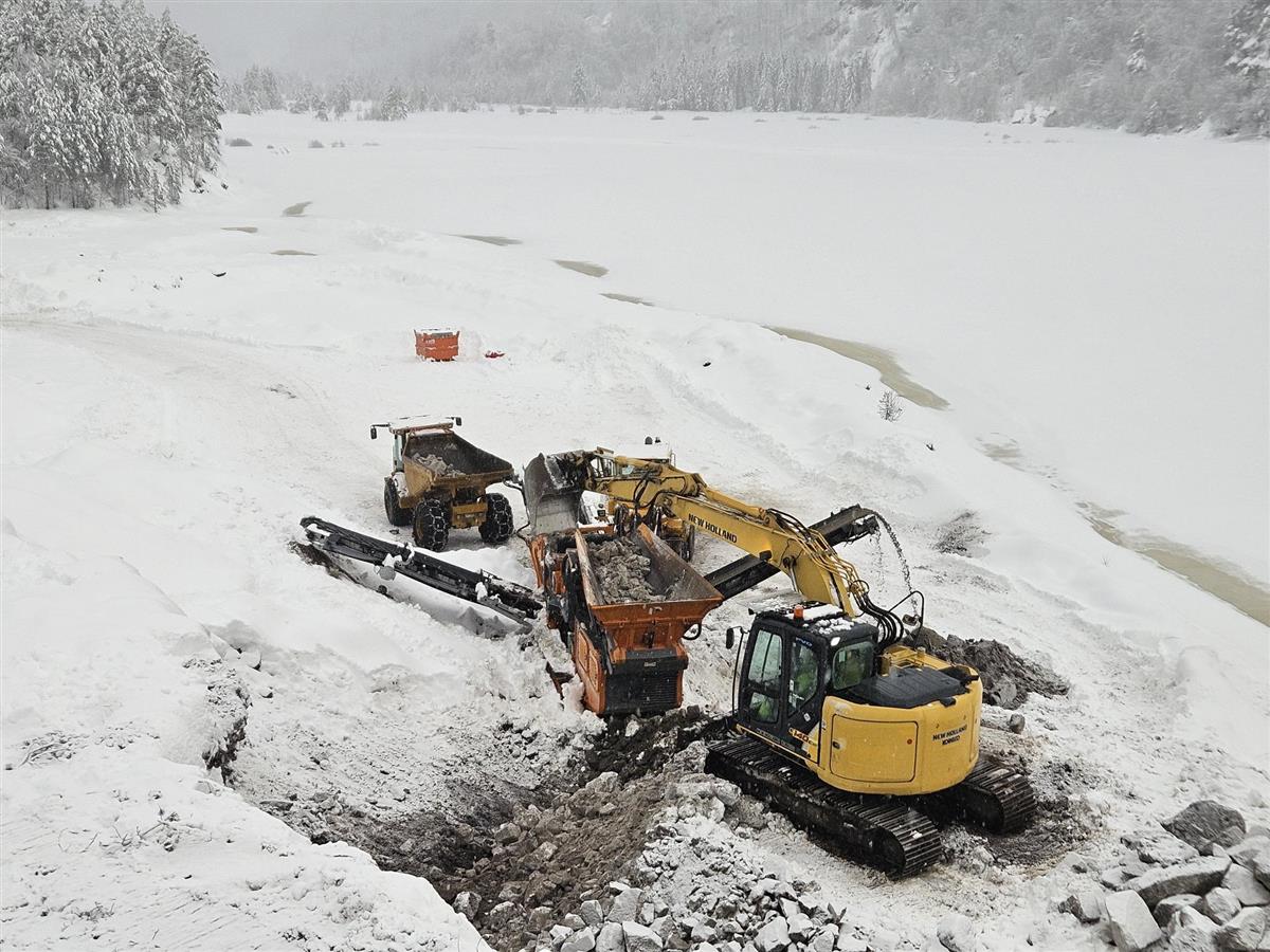 Vg2 Anleggsteknikk er igang med sikte masser til bruk på FV4040. Her siktes grusen ut av steinmassene. Her går maskinopplæring, gjenbruk og bærekraft hånd i hånd.
